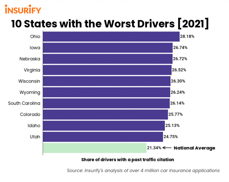 Conversely, Insurify also found that Michigan has the best drivers in the country, with only 15% of drivers in the state having traffic citations from the past seven years. Michigan’s traffic incident rate is almost 50% lower than Ohio’s, says the study.